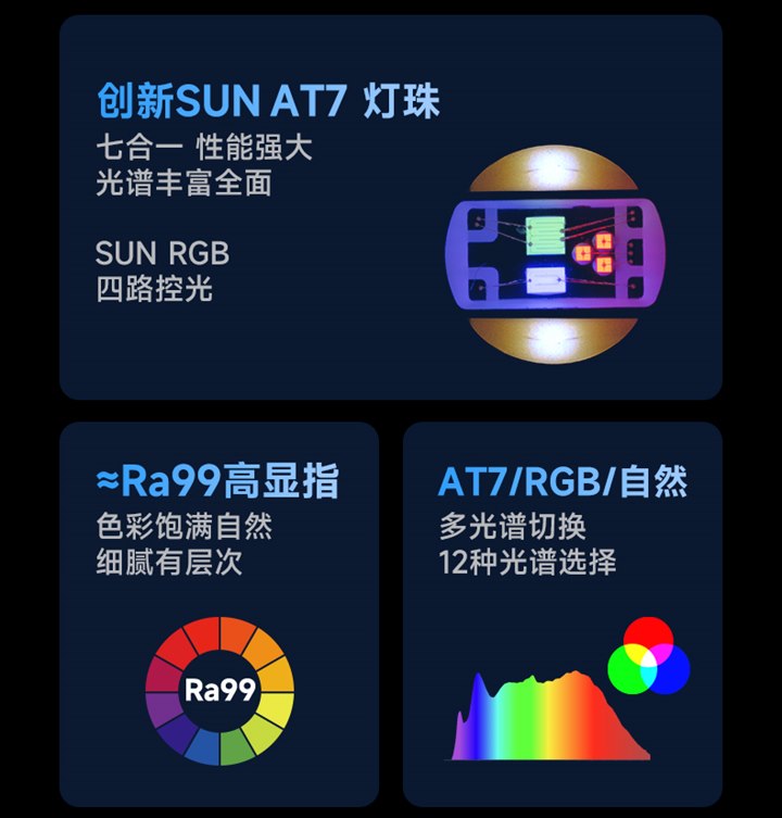 - ◆ 七合一燈珠技術:採用先進七合一 AT7s-II 燈珠,相較前代擁有更高的 RA 值,提供更出色的顯色效果。